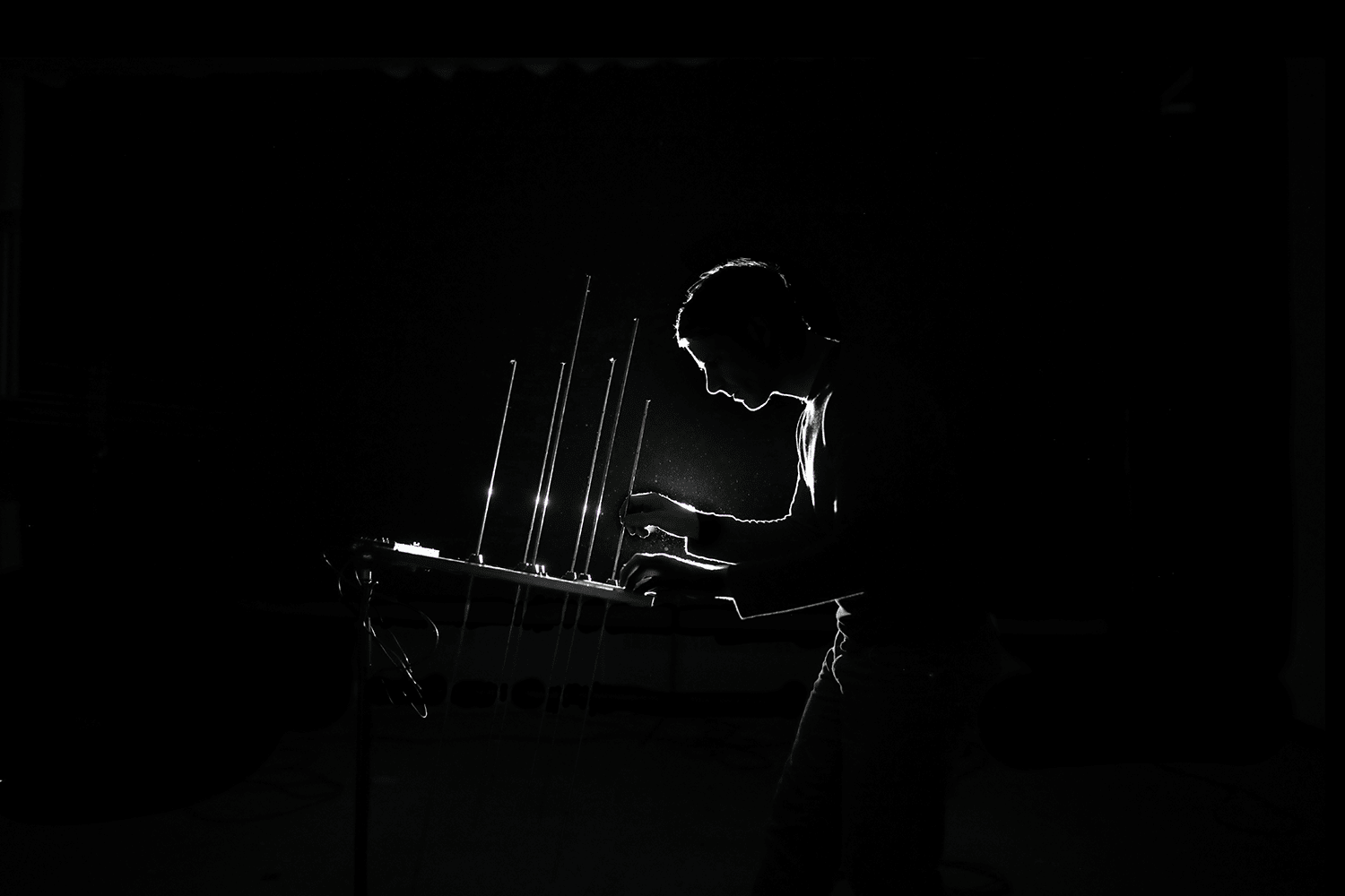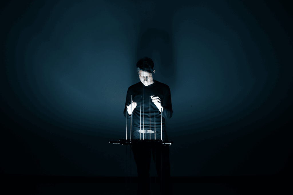 La cámara de eco retumba, vibra y palpita. Membranas, agujas, sensores… todos estos elementos nos trasladan a un fantástico laboratorio en el que luz y sonido dan forma al imaginario de nuestra psique. Y Martin Messier es el único operador de dicho laboratorio, capaz de activar los mecanismos para conseguir que esos flujos inaudibles e invisibles se materialicen y se vuelvan perceptibles para el espectador.